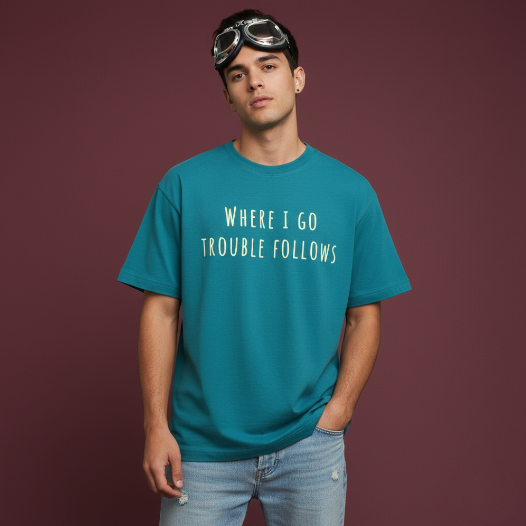 ✅ Quirky text prints: “Trouble” & “Where I go, trouble follows”